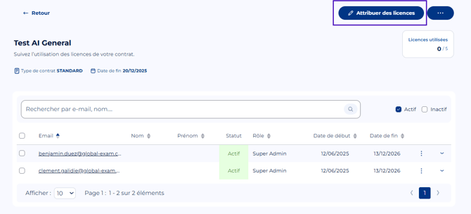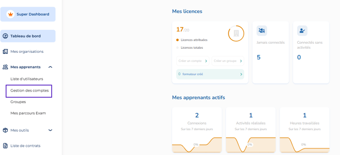 - Rendez-vous dans lâonglet « Mes apprenants » dans le menu vertical Ă gauche puis sur « Gestion des comptes ». Ou bien depuis la liste des contrats en cliquant sur "Attribuer des licences"
