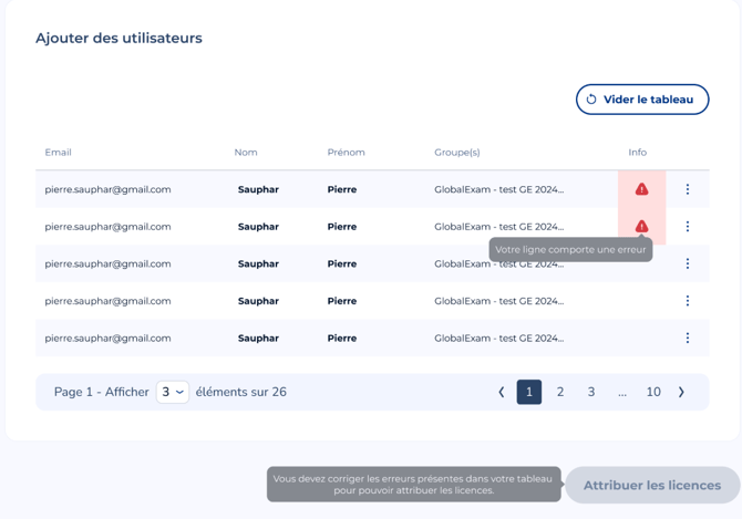Une pré-visualisation complÚte du fichier est affichée avant validation : erreurs, doublons, lignes incomplÚtes ; tout est signalé clairement pour éviter les mauvaises surprises