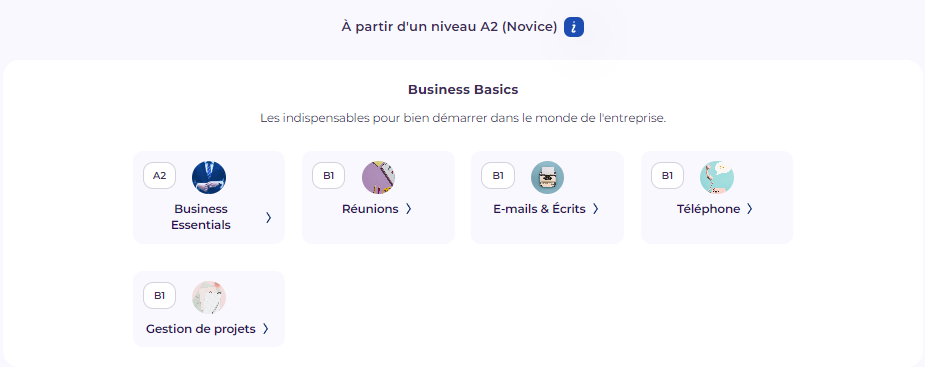 - Le Business Basics : ce parcours vous permet d’acquérir de nouvelles compétences qui vous serviront dans des situations professionnelles de tous les jours 💪.