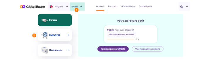 - Depuis votre espace apprenant, cliquez sur Exam puis choisissez l'univers qui vous intéresse (General ou Business)