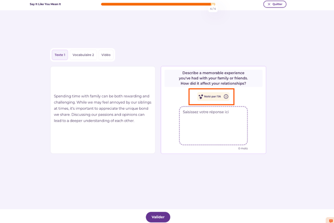 Les questions IA Writing reprennent le format des activités d’écriture classiques, avec un macaron spécifique signalant que la correction sera automatique par l’IA.