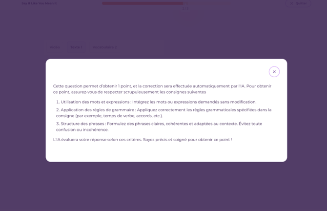 En cliquant sur ce macaron, vous ouvrez une fenêtre explicative : elle vous présente en détail les critères d’évaluation, pour que vous sachiez exactement ce que l’on attend de vous.